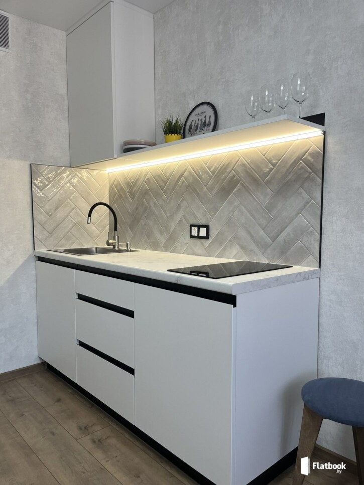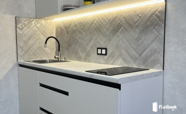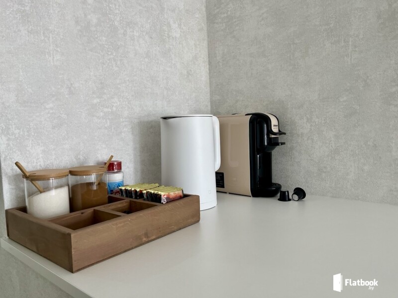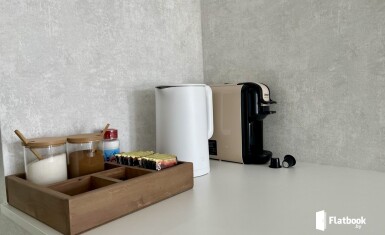 -полностью оборудованная кухня (плита, микроволновка, посуда, холодильник, чайник, капсульная кофемашина) -стиральная машина